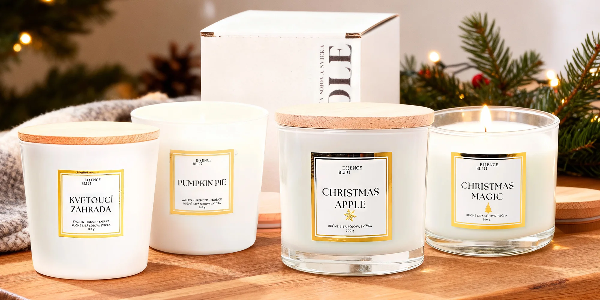 Vonné sójové svíčky Essence Bliss s dřevěným víčkem a dárkovou krabičkou