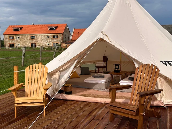 A aby to bylo dobrodružství jak se patří, ubytujete se ve stanu. Ovšem ne jen tak ledajakém – glampingový stan, to je luxusní příbytek s matracemi a peřinami, s elektrickými zásuvkami uvnitř a s dřevěnou terasou s posezením a ohništěm venku. Spát se vám tu bude náramně.