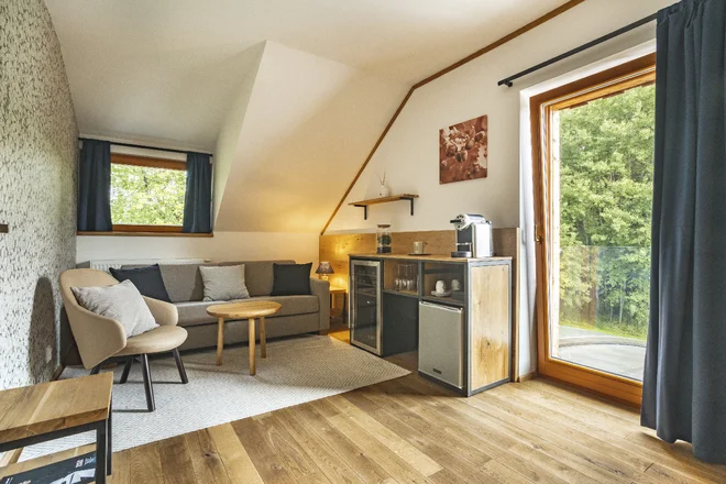 Celkem je tu 8 pokojů, pojmenované jsou podle stromů, které rostou v okolí a jejichž dřevo bylo použito při výrobě nábytku – borovice, akát, modřín, jasan, olše, dub, javor a buk. Ke každému pokoji patří vlastní sociální zařízení a na všech je také LED televizor. K dispozici budete mít také vinotéku či vinnou lednici a kávovar Nespresso. Během pobytu si budete zapisovat, co jste vypili, a útratu zaplatíte při odjezdu.