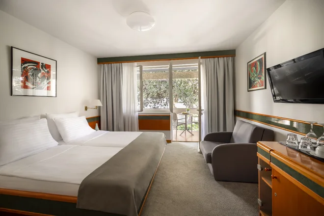 Příjemné ubytování pro vás bude připraveno v klimatizovaných pokojích typu Premium s manželskou postelí a přistýlkou nebo bez. K dispozici budete mít vlastní koupelnu se sprchovým koutem, WC a hotelovou kosmetikou. Všechny pokoje mají také balkon s posezením a chybět vám nebude ani televize.