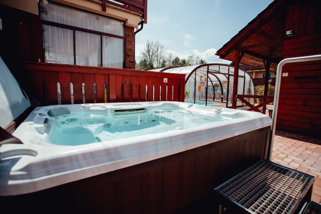 - Bazén 12×6 m s protiproudem, masážními tryskami a posuvným vysokým zastřešením
