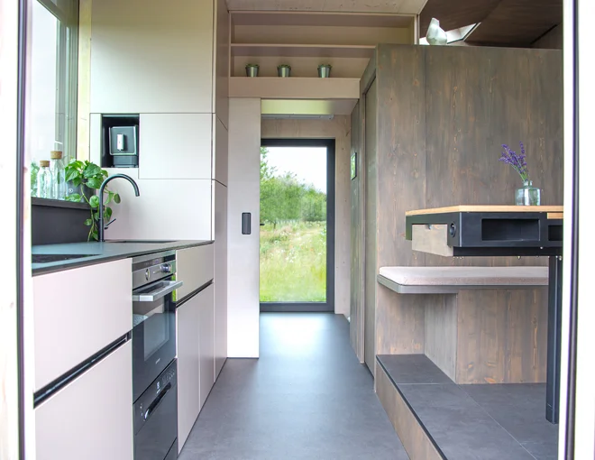 Srdcem každé ulity je hlavní obytná místnost s jídelním koutem a plně vybavenou kuchyní, ve které najdete sporák a varnou desku, kávovar, dřez, rychlovarnou konvici, ledničku i myčku. Nad jídelním koutem je připravena vyvýšená spací nika pro dvě osoby. Další lůžko a dvě přistýlky najdete ve vedlejší místnosti. Na spaní můžete využít také lavici v jídelním koutě. V ulitě se tak pohodlně vyspí až 5 hostů.