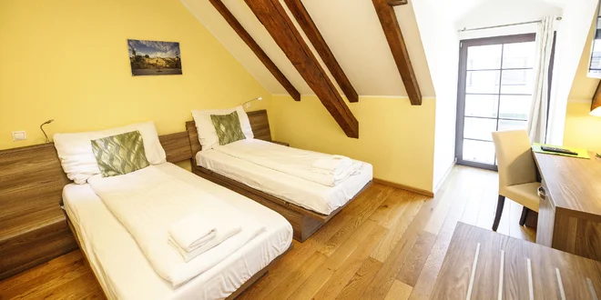 V jednom ze šesti vkusně zařízených podkrovních pokojů najdete dokonalé zázemí pro odpočinek. Patří k nim moderní koupelna se sprchovým koutem a fénem, využít můžete bezplatné Wi‑Fi připojení k internetu, televizi a trezor.