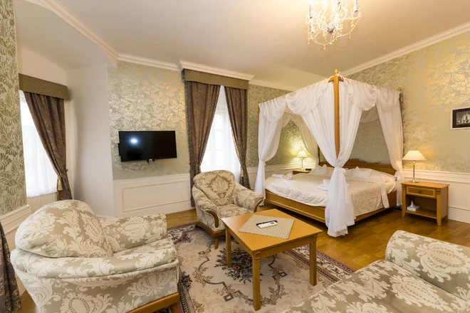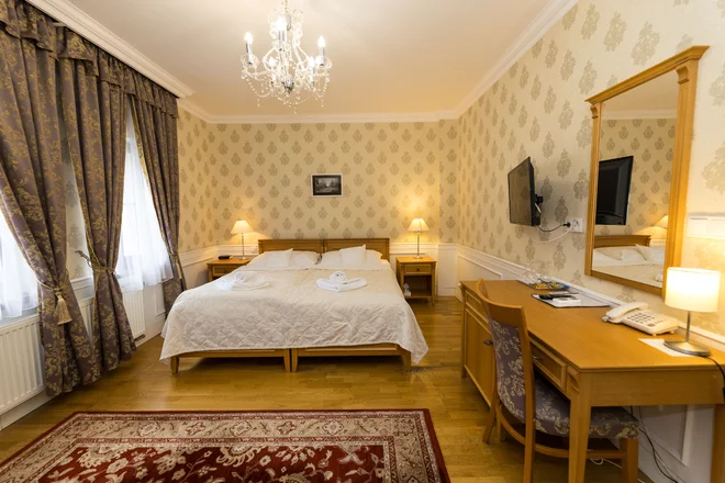 Personál vám připraví útulný dvoulůžkový pokoj podle výběru – zvolit můžete pokoj v podkroví nebo v prvním patře, kde je i možnost přistýlky, případně Knížecí apartmá s postelí s nebesy. Všechny mají televizi, ledničku, trezor, Wi‑Fi, pracovní stůl a koupelnu s toaletou. V hotelu je výtah, takže nemusíte do patra po schodech.