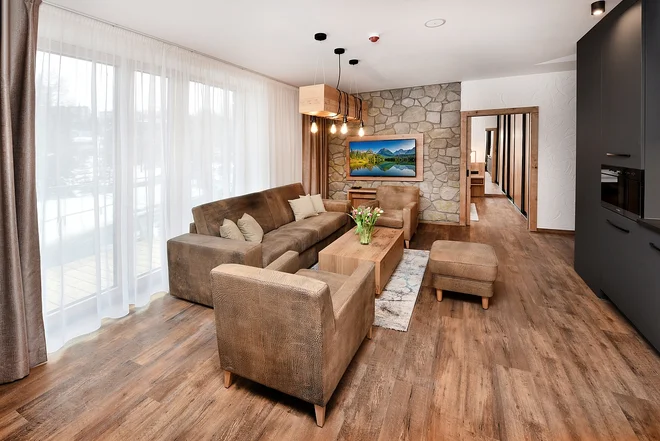 Obývací pokoj je vybaven pohodlnou pohovkou a TV se satelitem. Součástí apartmánu je také jídelní kout a koupelna se sprchovým koutem, toaletou a fénem na vlasy. Některé apartmány disponují balkonem, ze kterého si můžete vychutnat výhled na tatranskou přírodu. Samozřejmostí je bezplatné připojení na Wi‑Fi a parkování zdarma.