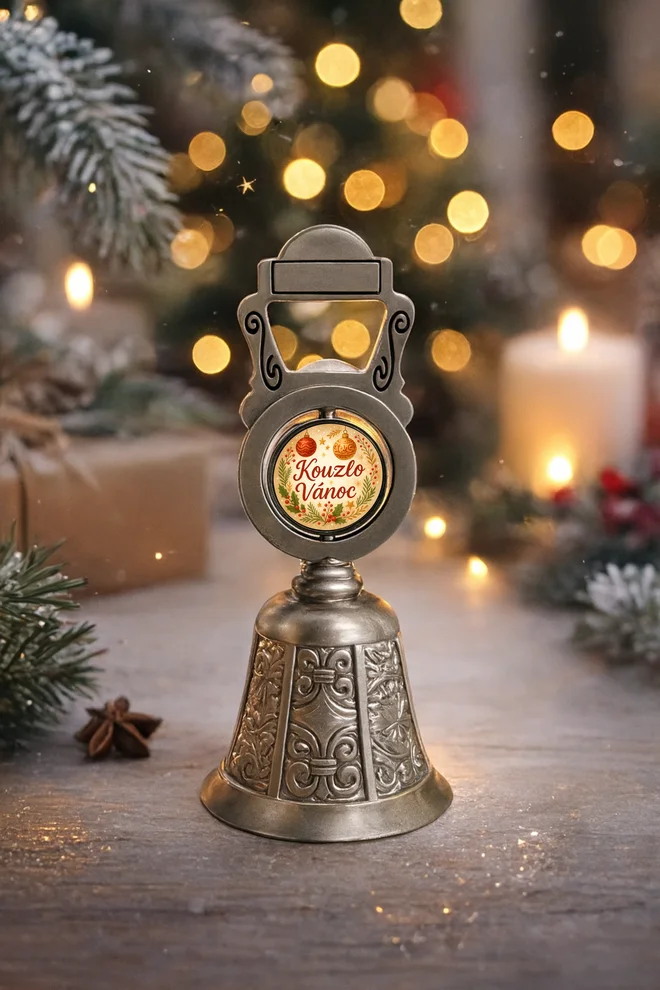 Kovový zvoneček vysoký 11 centimetrů zdobí kromě rytin také barevná oboustranná čočka – symbol očekávání, radosti a vánočních přání. Ta je vyrobená v České republice a jsou na ní buď andílci a andělky v nejrůznějších podobách, sněhové vločky, nebo nápisy volající kouzlo Vánoc. Tak šťastné, veselé a zvonivé!