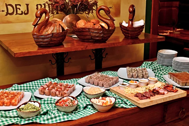 Ještě než stihnete smočit rty v ležáku Bohemia Goose, jistě se vydáte očíhnout bohatě prostřený stůl se studeným bufetem, který vám nabídne variaci českých chuťovek, předkrmů, lahůdek a salátů. Tak si račte nabrat, co jen hladové hrdlo ráčí. Žaludek ale jen rozehřejte a nechte si dostatek místa na degustaci hlavních chodů.