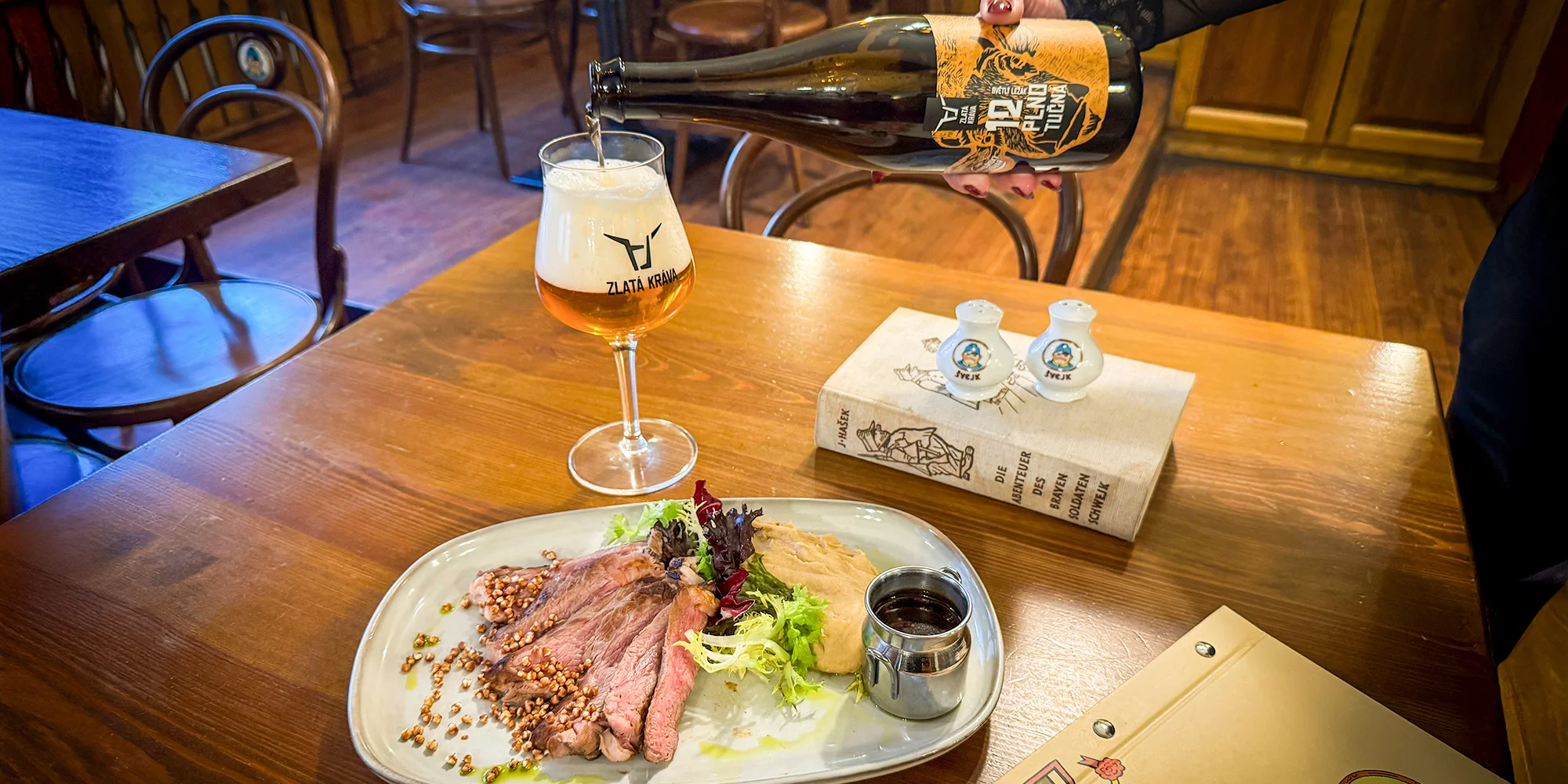 Přijměte pozvání do Švejk restaurantu „U Pětatřicátníků“. Podávat se bude tříchodové menu pro dva, které v sobě snoubí jedinečnou chuť hovězího masa plemene Aberdeen Angus v bio kvalitě s řemeslným pivem. Zatímco maso pochází z pastvin vlastní ekologické farmy Sochorův statek, pivo vaří ve farmářském pivovaru v Nepomuku paní sládková Žaneta.