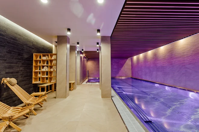 • 13metrový bazén s protiproudem a masážními tryskami, suchá a parní sauna, ochlazovací káď, relaxační místnost