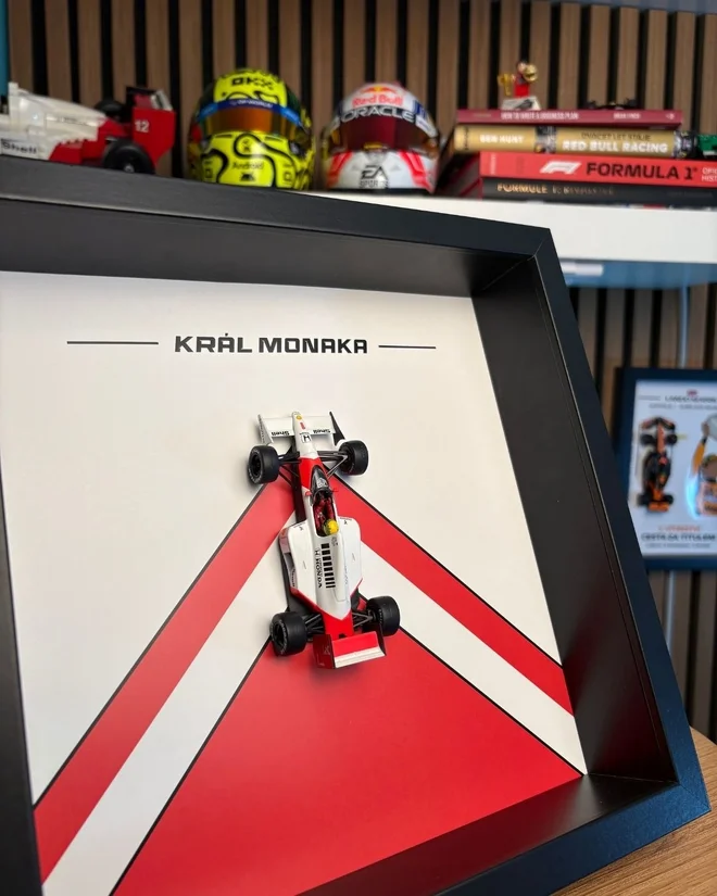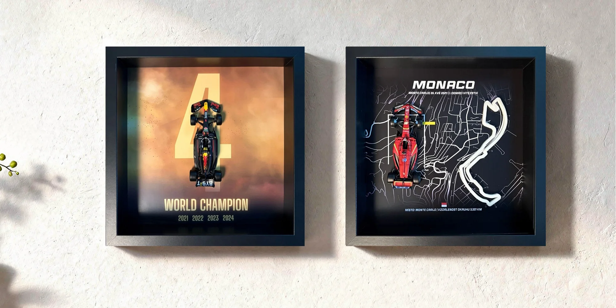 Uvnitř každého rámečku najdete detailní model závodního monopostu v měřítku 1:43. Vybrané kousky jsou navíc doplněné i modelem ikonických tratí. Pověste si na stěnu kus historie a pociťte adrenalin: ať už si vyberete Monackého Prince, horko z Itálie s Domácím vítězstvím před Tifosi, oslavu dominance rámečkem 4. titul, nebo chladnou hlavu Australského icemana, každý kousek odráží legendární moment, dechberoucí vítězství a čistou závodní strategii.