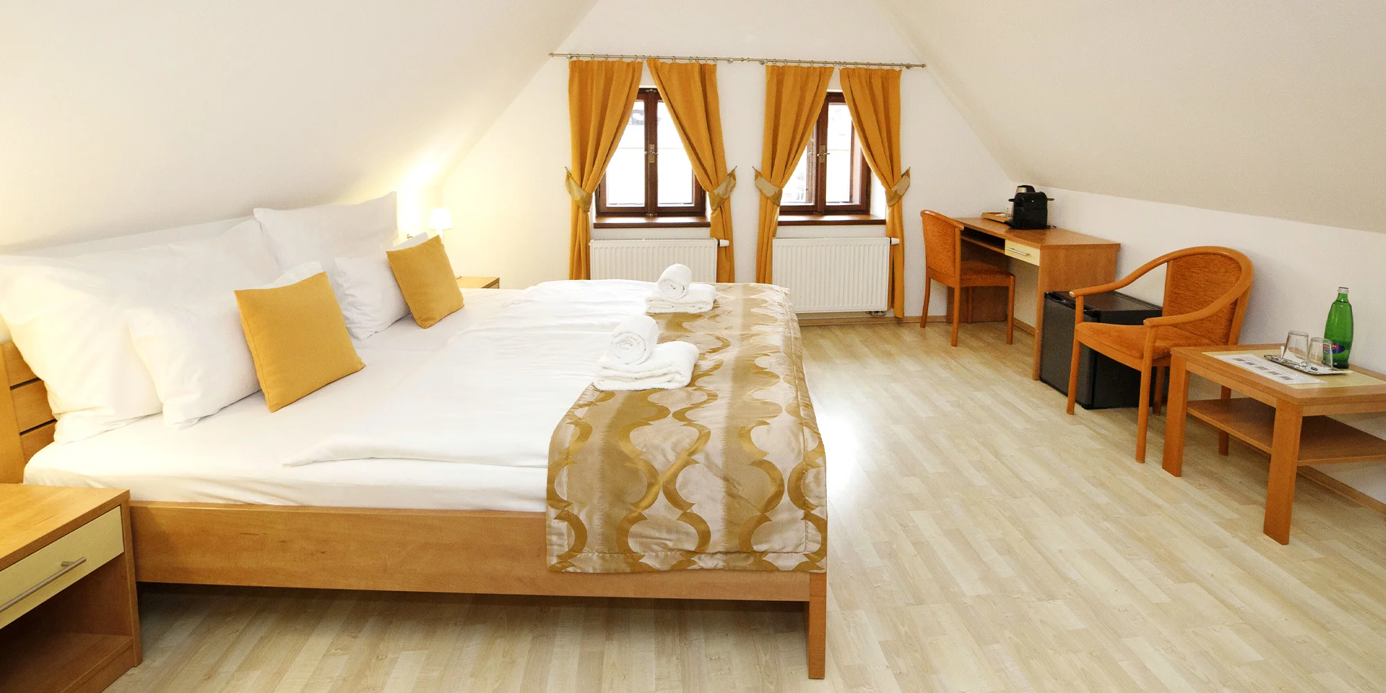 Nachystaný pro vás bude pokoj typu Standard či Deluxe nebo mezonetový či prostorný rodinný apartmán (50 m²). Jejich součástí je vždy koupelna s vanou nebo sprchou a fénem. Samozřejmě nebude chybět hotelová kosmetika.I když si nevyberete pobyt se snídaní, o ranní kávu nepřijdete. Budete mít totiž k dispozici Nespresso kávovar a/nebo rychlovarnou konvici. Wi‑Fi je zdarma v celém objektu.