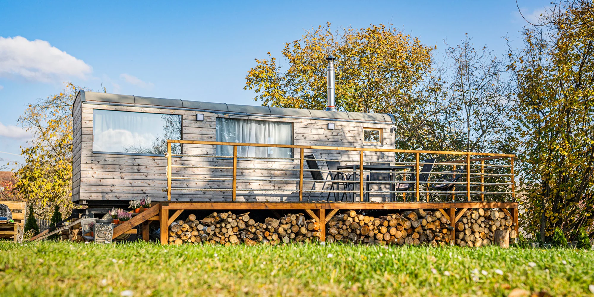 Útulná maringotka na Moravě s venkovní saunou a koupacím sudem