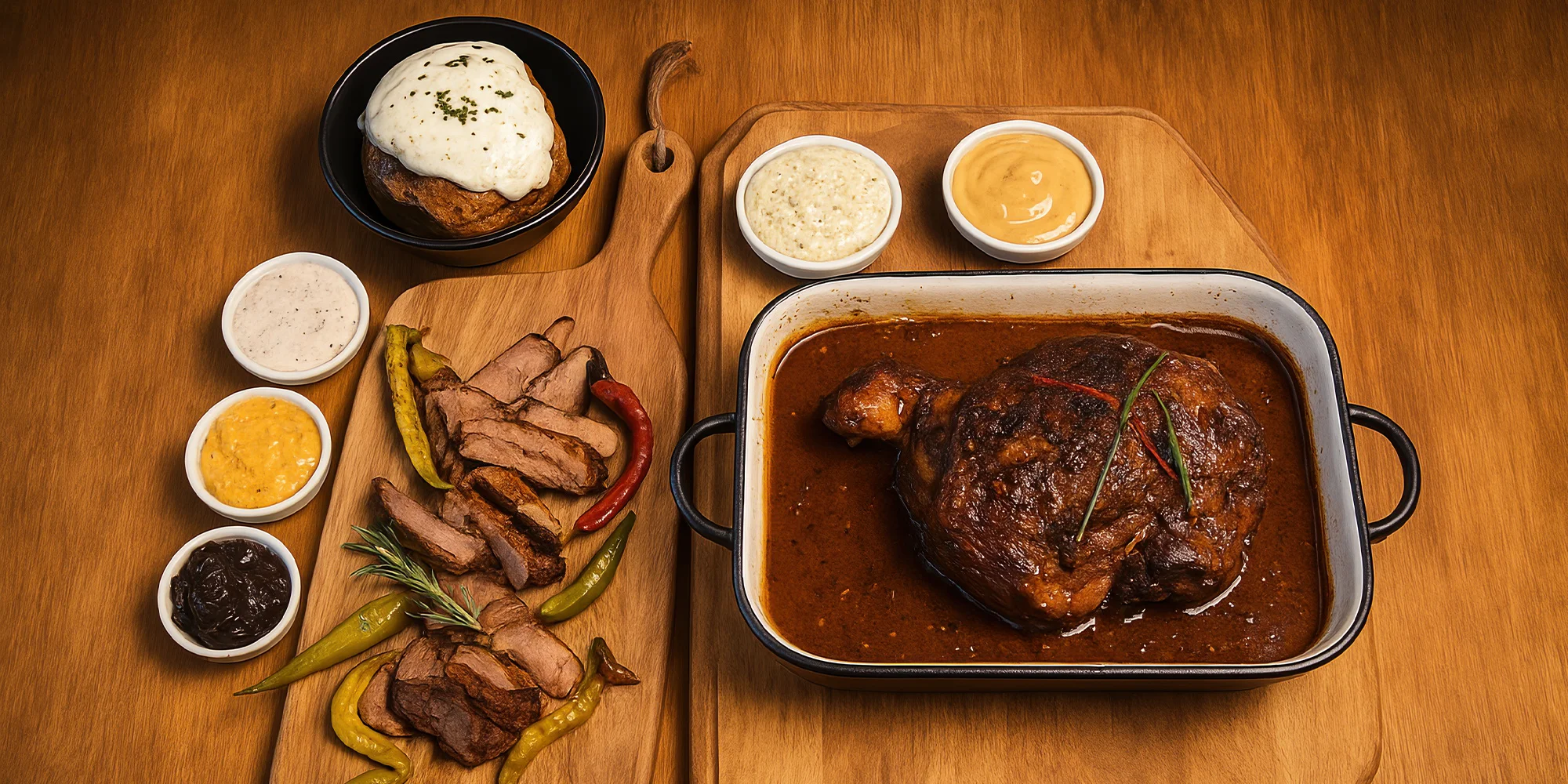 Těšte se na šťavnatý flank steak, rib eye, durock, panenku nebo krkovici, nebo sáhněte po variantě s kilem vepřového kolene. Chybět nebudou přílohy včetně domácího pečiva, hranolků a rozšlápnutého bramboru. Na prkno patří i kyselé okurky a ostré kozí rohy, které podtrhnou výrazné chutě. Celý zážitek doladí čtyři omáčky: domácí tatarka, kečup, chilli willy a marmeláda z červené řepy a brusinek.
