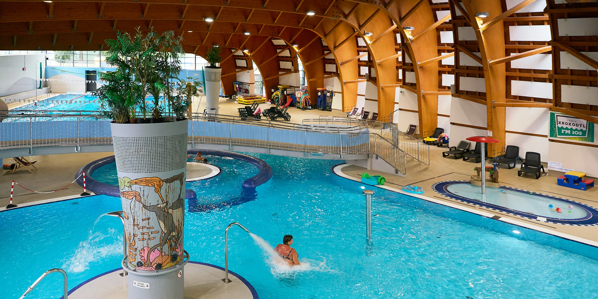 • Plavecký bazén, rekreační bazén s atrakcemi, vířivka, tobogán, dětské brouzdaliště s vodním hřibem, parní sauna, mokrý bar, střešní bazén (v provozu za teplých dní)