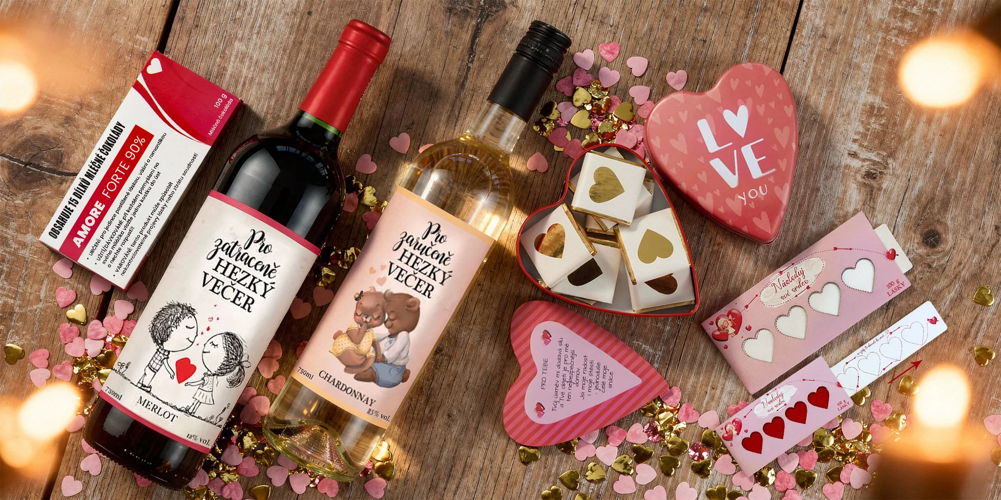 Pro romantický večer ve dvou se zase hodí pečlivě vybraná vína – jemné Chardonnay nebo harmonický Merlot v dárkových krabičkách. Skvěle doplní večeři, klidné posezení i dlouhý rozhovor plný zamilovaných pohledů.
