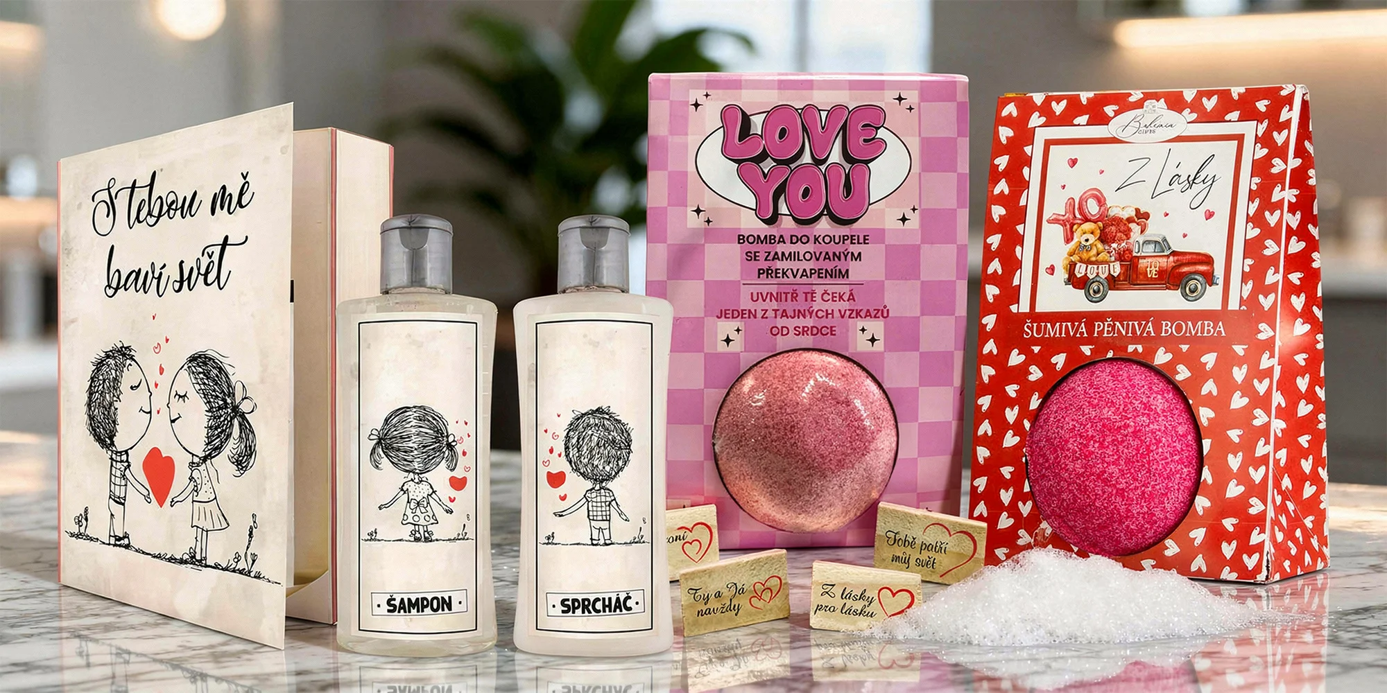 V nabídce e‑shopu Bohemia Gifts najdete takových bomb hned několik. Varianta Amore Bath potěší nápaditým obalem s textem pro zamilované i svou jemnou květinovou vůní. Verze Love You zas skrývá malé překvapení – po rozpuštění ve vaně se objeví dřevěná destička se zamilovaným vzkazem. Tohle originální vyznání dostane jednoduše každého!