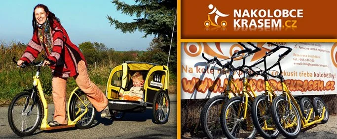 „Napadla mě během dneška, kolo-, kolo-, koloběžka.“ Ano, některé z méně kvalitních koloběžek mohou být opravdu zákeřné. Vzpínají se na zadní, vyhazují za jízdy a někdy i koušou. Když si však půjčíte klidný, vyrovnaný a správně seřízený kus, jízda na něm se stává požitkem a radostí opravdu pro každého, bez rozdílu věku i fyzické kondice. Tak tedy vzhůru dolů, malebnou krajinou Moravského krasu nebo okolo brněnských památek a zajímavostí. S dnešní nabídkou společnosti Nakolobce.cz to máte za méně než polovinu běžné ceny. Zapůjčení jedné koloběžky na jeden den v Brně nebo Moravském krasu včetně veškerého vybavení (helma, rukavice a zámek). Pro rodiny s dětmi je připravena i dětská sedačka nebo s příplatkem i vozík za kolo. Na dlouhé túry pak brašna na řidítka nebo nosič. Díky upravené síti desítek kilometrů cyklostezek s různým stupněm obtížnosti si užije opravdu každý. Typem na skvělý výlet s přáteli je možnost zapůjčení koloběžky přímo v Moravském krasu (Vilémovice) a její vrácení v Brně. Délka doporučené trasy je cca 40 kilometrů, po většinu cesty z kopce. A ti co prahnou po tom vidět toho co nejvíce, mohou využít služeb zkušeného průvodce. Společnost Nakolobce.cz disponuje širokou základnou koloběžek několika typů i velikostí. Připraveny jsou stroje pro děti i dospělé, do města i do terénu, pro dvoumetrové chlapy, křehké dívky i nejmenší ratolesti. Samotné zapůjčení stroje a příslušenství je řešeno smlouvou o nájmu podepsanou při převzetí. Nájemcem může být pouze osoba starší 15 let. Práva a povinnosti pronajímatele i zákazníka jsou řešeny pomocí srozumitelného výpůjčního řádu. V něm se dočtete všechny důležité informace o výši vratné zálohy i poplatku za případné vrácení silně znečištěné koloběžky.