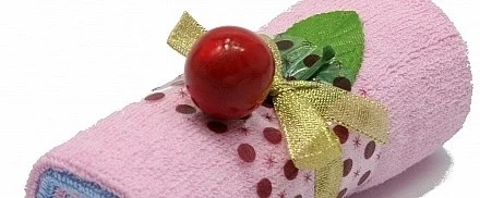 Jsou to 2 malé ručníky 30 × 30 cm různých barev zavázané zlatou stuhou. A aby byl vzhled co nejpodobnější zákusku, je na roládě umělohmotná třešnička s listem. Navíc ji dostanete v krabičce, takže na první pohled roláda působí jako pravý zákusek…