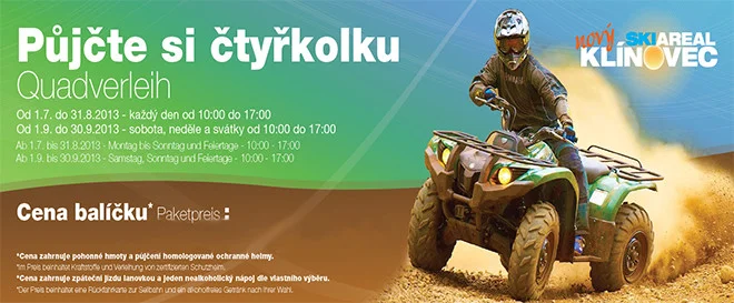 Balíček zahrnuje 15, 30 nebo 45 min jízdy na čtyřkolce, obousměrnou jízdu lanovkou na vrchol Klínovce (1244m.n.m.) a nápoj zdarma dle vlastního výběru s výhledem na německý Oberwiesenthal.
