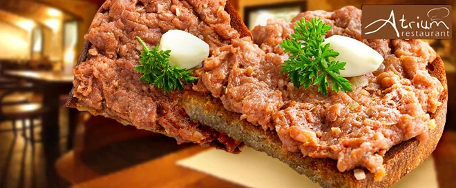 Přijďte rozluštit kulinářskou hádanku do originální sklepní restaurace Atrium a vychutnejte si 400 gramů jemného tatarského bifteku z pravé hovězí svíčkové a 12 topinek s česnekem.
