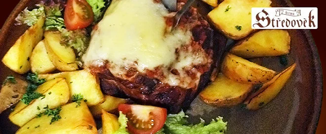 - 1× hořící hranici (1 kg) = pečená krkovice špikovaná česnekem a slaninou, zapečená s rajčatovým pyré, sypaná sýrem