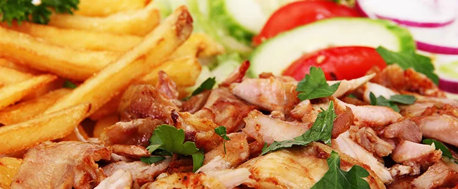 Oba 400gramové kuřecí gyrosy v pravém pečeném pita chlebu jsou doplněny o hranolky, samozřejmostí jsou tzatziky, rajčata a cibule.