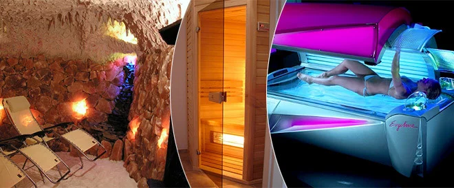 • NEBO 2× vstup do solné jeskyně pro dospělou osobu (2× 150 Kč) + 2× vstup do sauny na 2 hodiny pro dospělou osobu (2× 170 Kč) + 2× 6 minut v soláriu (2× 80 Kč) + 2× kvalitní solární opalovací krém Tanny Maxx (2× 50 Kč)+ 2× infrasauna 30 minut (2×90 Kč) +2× osuška (60 Kč)