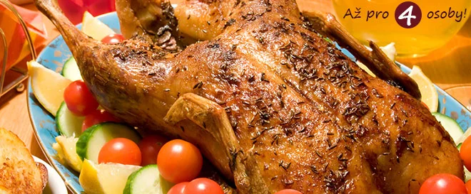 - skvostně propečená kachnička, jejíž maso se od kosti samo odlupuje, váží celé 2 kg (v syrovém stavu)