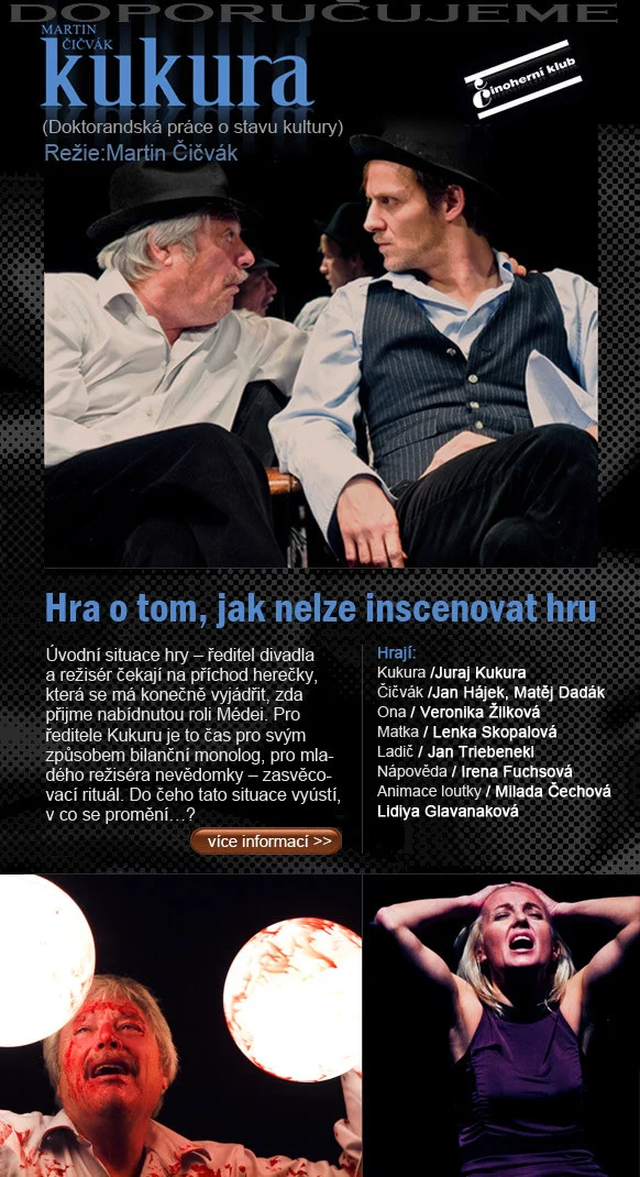 V dějinách dramatu se často setkáváme s divadlem na divadle. Méně běžné ale už je, aby divadlo přímo tematizovalo podmínky svého vzniku, nebo dokonce svou nemožnost. V jistém smyslu bychom mohli téma hry Kukura popsat větou: Příběh o tom, jak se tady nedá inscenovat Médea. Kukura je hra, která dělá divadlo z nemožnosti divadla, zdivadelňuje boj s tím, co ho ohrožuje a ničí.