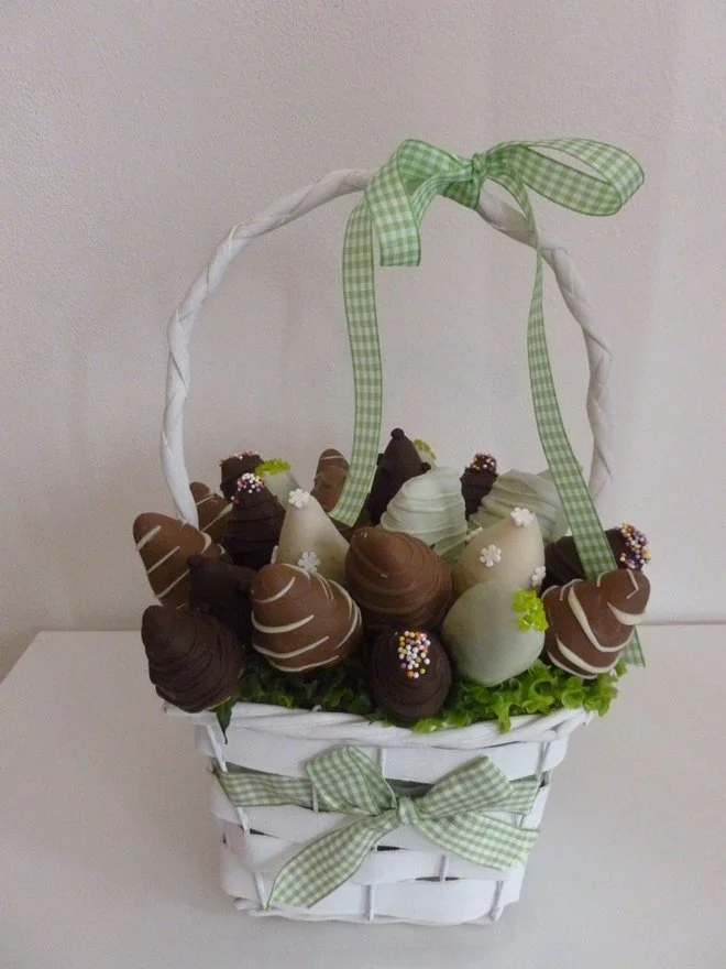 Košíček plný sladkých, v čokoládě obalených jahůdek, ozdobených různými posypkami.