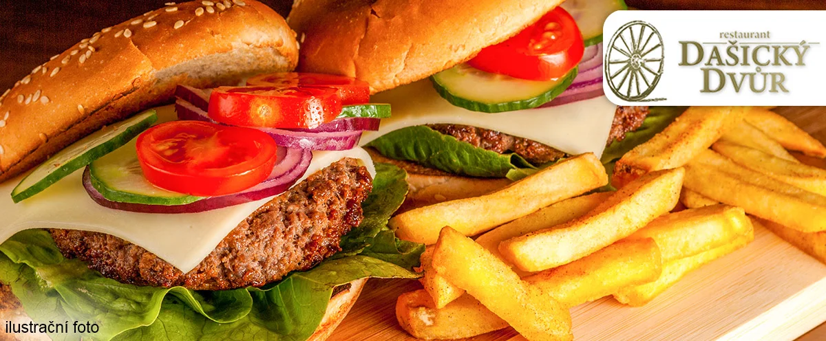 Přijměte pozvání do restaurace Dašický Dvůr na šťavnatý burger se zeleninou, hranolkami a omáčkou. Voucher platí pro dva, takže nezapomeňte pozvat svého oblíbeného spolustolovníka.
