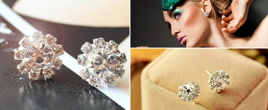 Stříbrné náušnice ve tvaru kytičky mají průměr 2,2 cm, mají upevněny 1 velký a 9 malých křišťálků po stranách. Zapínání formou puzety.