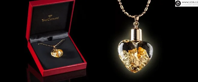 Náhrdelník se zlatým řetízkem má přívěsek ve tvaru srdce, které je naplněno 24 karátovým zlatem.