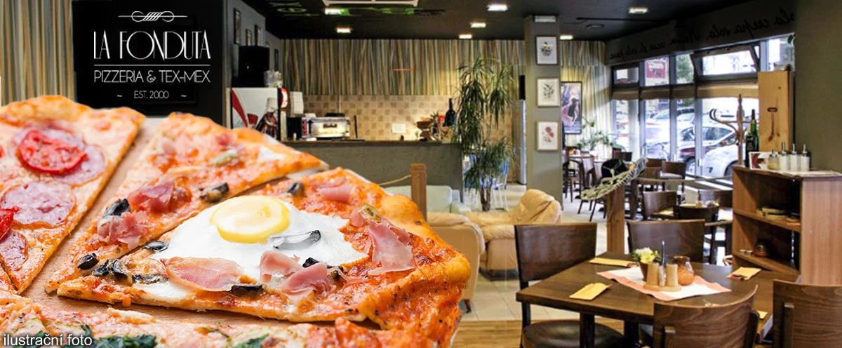 Objednejte si dvě ukázkové pizzy v restauraci La Fonduta. Každá bude mít průměr 32 cm a můžete si ji sníst v restauraci nebo nechat dovézt domů – podle toho si vyberte variantu voucheru.