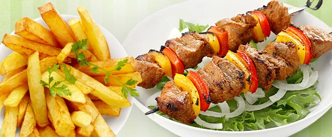 Zkušený šéfkuchař vám na jehlici hezky na střídačku napíchne vepřové, kuřecí a krůtí maso, které ještě proloží anglickou slaninou a klobásou, paprikášem, cibulí, pórkem a paprikou. Na přikousnutí dostanete celou kopu hranolek.
