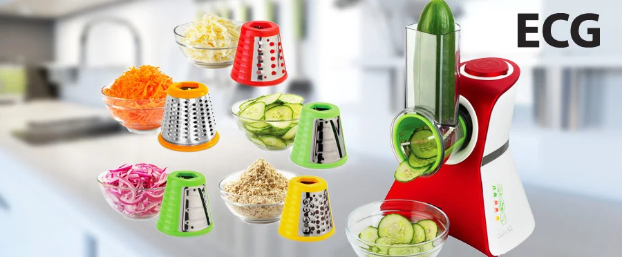 Elektrické struhadlo ECG ES 150 Quick&Fresh ale disponuje hned 5 nástavci na hrubé a jemné strouhání, na tenké a vlnité plátky a na mletí ořechů.