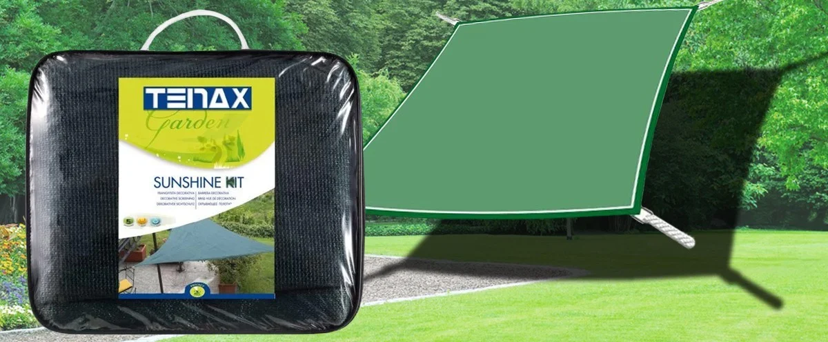 Sada zahradního stínění se skládá z velmi husté tkaniny s oky a s obrubou, která je vyztužená a má na každém rohu kovové kroužky.