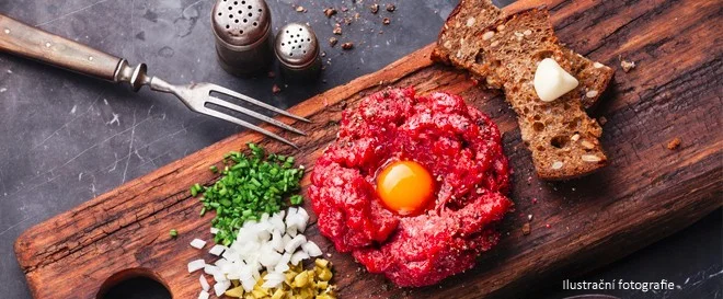 Tatarák z flank steaku je jemně sekaný a kuchařem jemně ochucený.