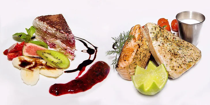 - 200g filátko z lososa grilované v zelených bylinkách s limetkou podávané na smetanovém špenátu, medovo hořčicový přeliv s koprem, mačkané brambory se šalotkou