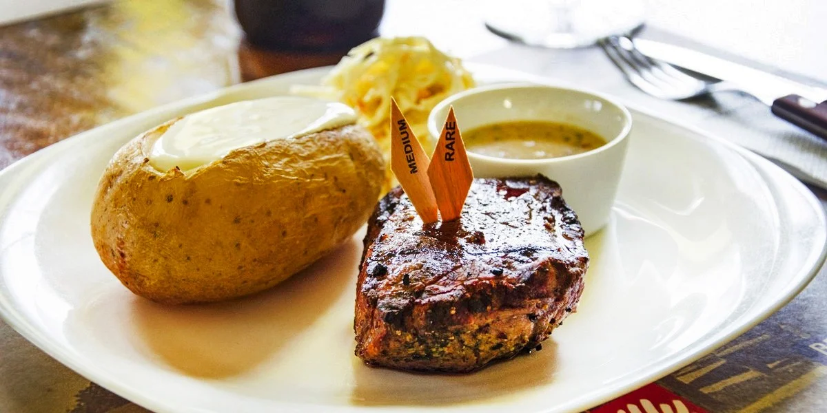 200g jihoamerický rumpsteak Chicago se smaženou cibulkou a slaninou, salátkem coleslaw a pečenou bramborou se zakysanou smetanou