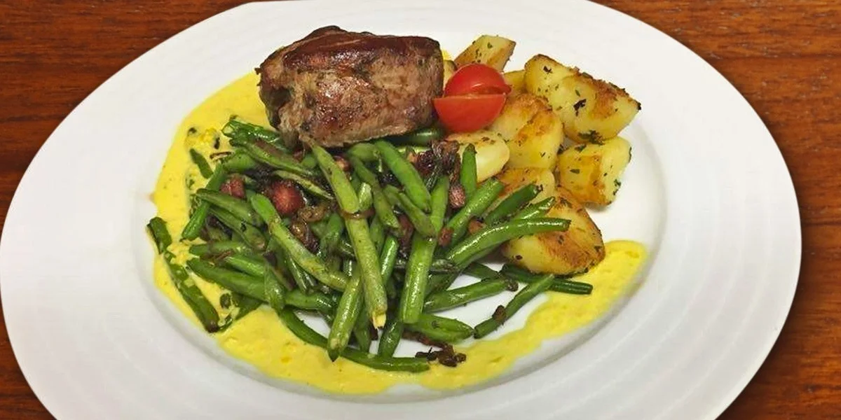 V moderním olomouckém Café & restaurantu Jilian si pochutnáte na steaku z hovězí svíčkové, který se podává na restovaných fazolových luscích se slaninou. Jako příloha k němu dokonale ladí opékané brambory.