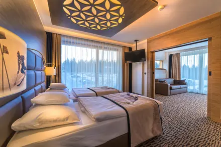 Na rozdíl od typických hotelů v Zakopaném, jež jsou navrženy a postaveny v duchu horských chat, nese Nosalowy Park Hotel & Spa punc luxusu – od exteriéru přes wellness zónu po lobby a pokoje, jimž dominují netradiční designové prvky. Ke každému pokoji patří krásná mramorová koupelna s fénem a k dispozici budete mít luxusní kosmetické produkty Guerlain.
