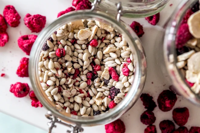 U nás pak balíčky sesypeme do velkých sklenic. Do jedné jde velké sušené ovoce, do další pak semínka a oříšky. Letos prvně jsem u Velkoobchodu Pohoda objednala i loupaná slunečnicová semínka a jeden pytlík slunečnicových semínek, která jsou máčená v jogurtové polevě.