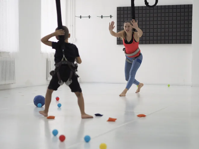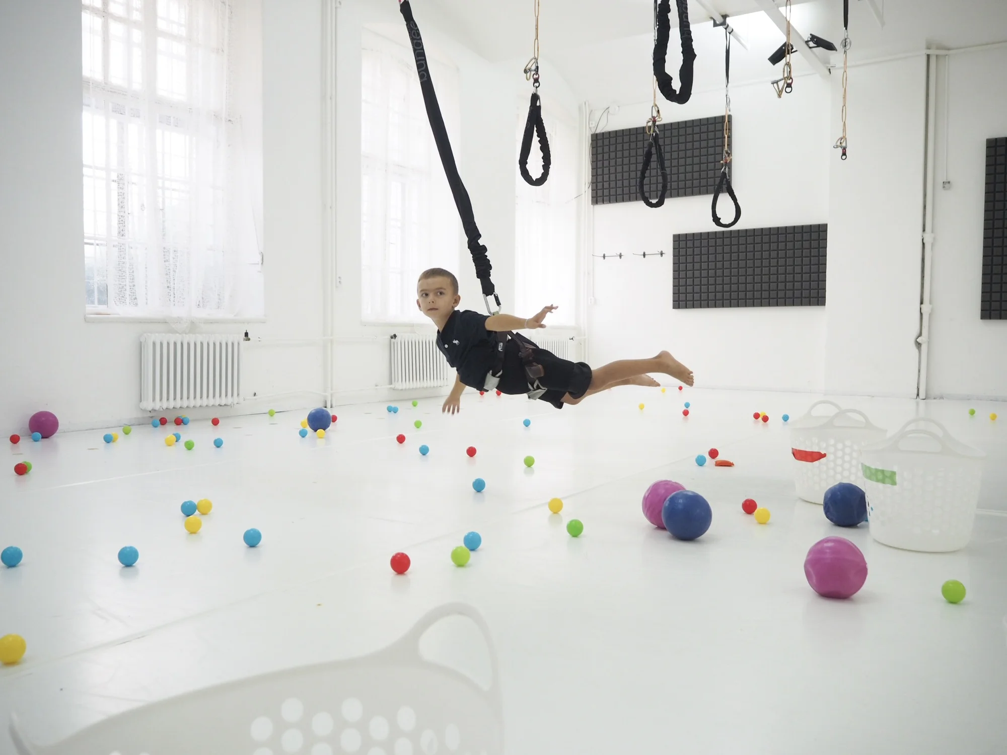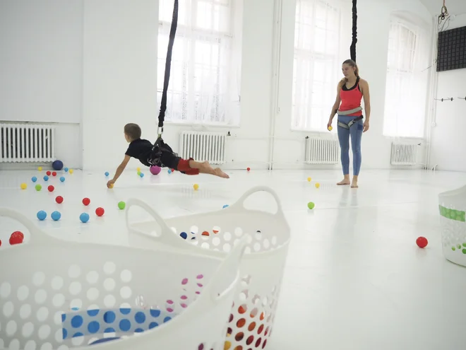 Z Lukáška jsme po chvíli vycítily menší nervozitu (stává se mu to, když dělá něco, co nezná), ale lektorka si ihned poradila. Přinesla plné koše barevných míčků a bylo o zábavu postaráno. Lukášek visící na laně je skoro všechny vysbíral a v letu je pak házel do košů. Tohle baví všechny děti!!! Zaměřil se na zpevnění těla a pak se soustředil na trefu na koš. Super sledovat to soustředění a nadšení.