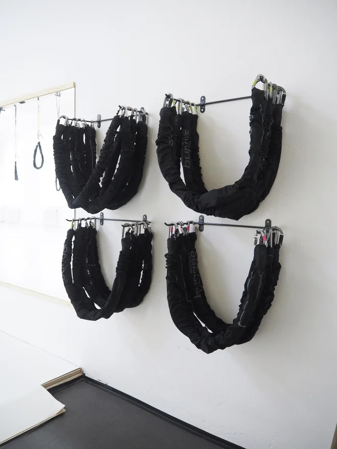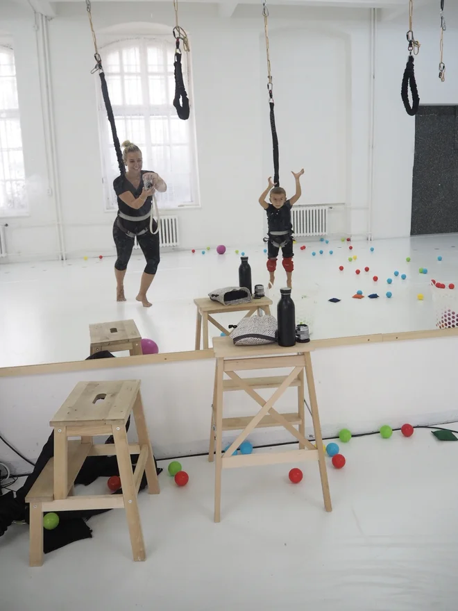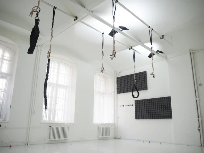 Jakmile jste převlečení, dostanete „vycpané“ kraťasy a lektorka vám pomůže dostat se do popruhů, na kterých poté budete viset. Lektorka zvolí lano odpovídající vaší váze. Následovalo postavení se na značky a učení se základního postoje. Prostě visíte vodorovně k zemi a máte co nejvíce zpevněné tělo.