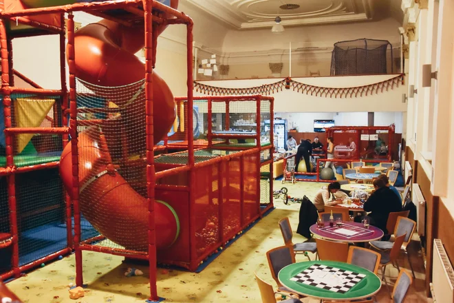 Bambino bych zhodnotila jako prima variantu mezi kavárnou s dětským koutkem, který ale bývá dost malý, a velkým dětským hřištěm, kde zase nemůžete sedět přímo u dětí a jídelní prostor je oddělený. Tady máte obojí v jednom. V hlavním sále jsou podél atrakcí stolečky, na některých z nich i herní plány.