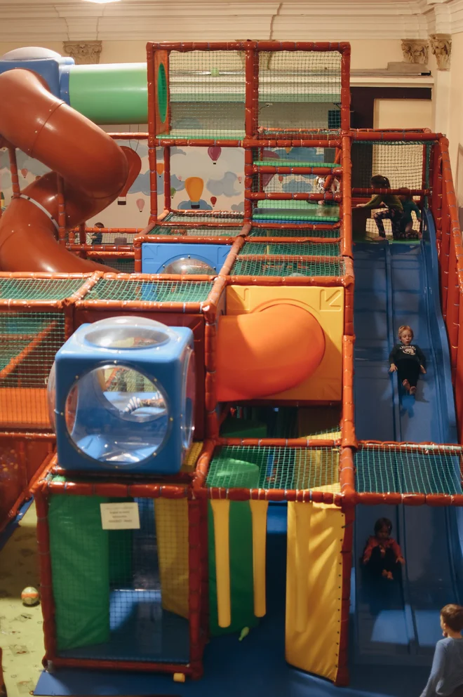 V hlavním sále jsou pak ty pro děti nejzajímavější atrakce. Velká hrací konstrukce čítá několik síťových chodeb, překážek, výlezů, rourových průlezů, propadlišť a taky oblíbené skluzavky.
