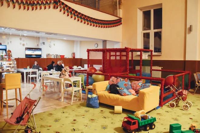 My jsme se nakonec usadili v zadní, víc klidnější místnosti. Nachází se tam totiž koutek pro ty úplně nejmenší a nám to vyhovovalo mnohem víc, vzhledem k tomu, že jsme s sebou měli i čtyřměsíční miminko. Navíc jsme si s ním pak mohli hrát i na zemi, aniž bychom se báli, že na něj někdo šlápne.