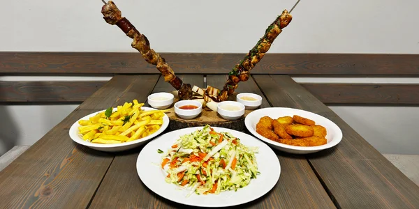 Meče s grilovaným masem i přílohy a omáčky pro dva