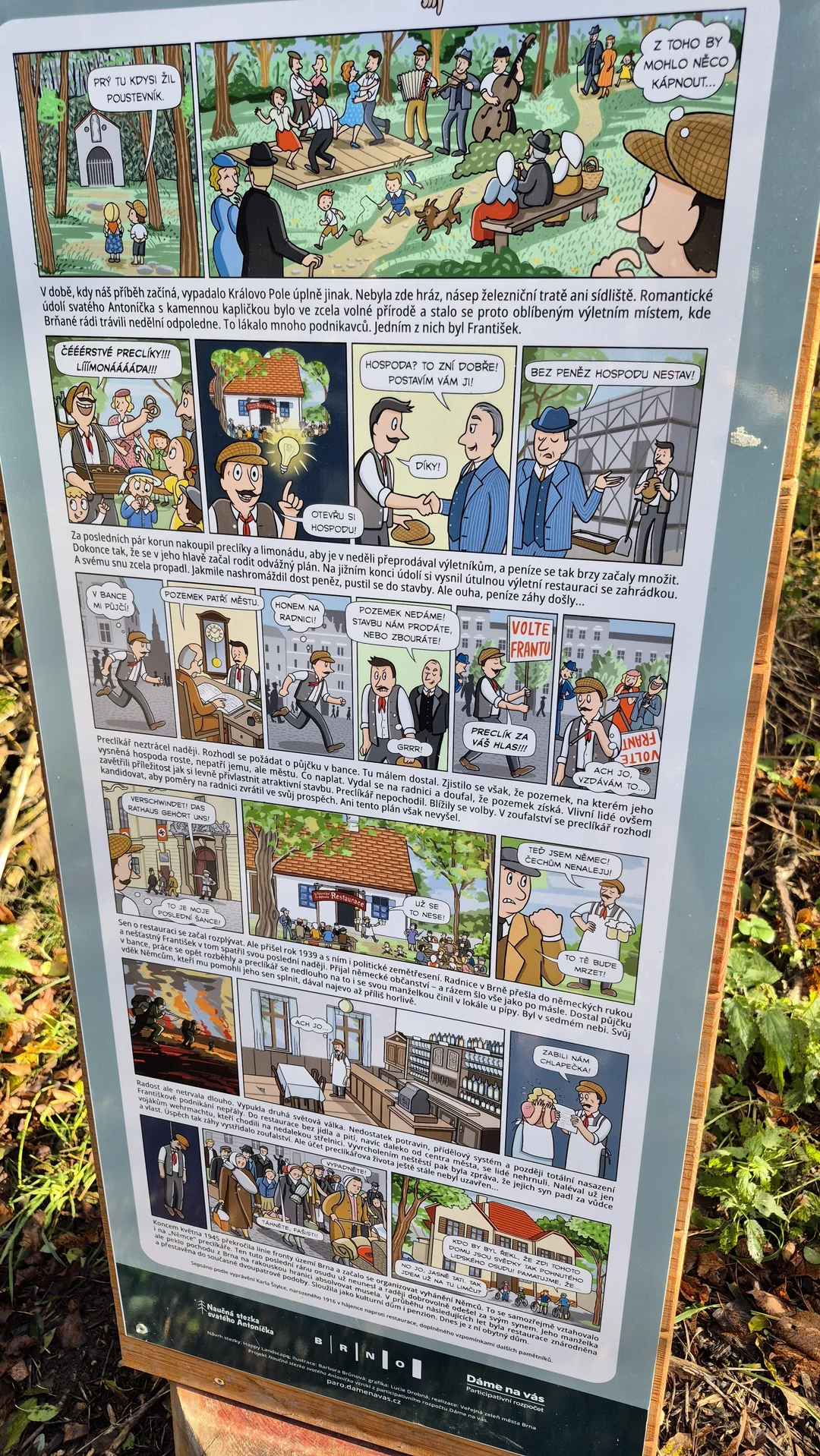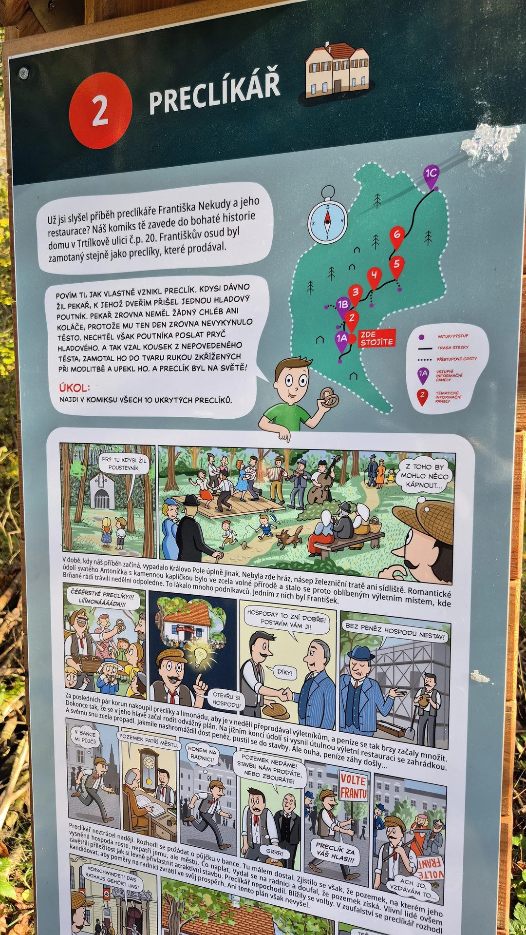 Přečtete si tu legendy o svatém Antonínovi z Padovy, příběh místního preclíkáře, nebo třeba o trampotách vojáků za Prusko-rakouské války. K naučné stezce se lze připojit ze tří míst, a to od hřiště Ondřeje Sekory na ulici Sadová, od dětského hřiště „Pirátská loď“ u restaurace Maníkova pizza, či od domu pro seniory na Lesné.